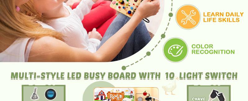 [Montessori Busy Board for Toddlers] Our busy board is placed different complexity switches, which include light bulbs that match the light of the switch. There are 10 different switches and 19 LED light bulbs set on this busy board. This sensory board will help your children enjoy hours of entertainment. Requires 2 AAA batteries (batteries not included).