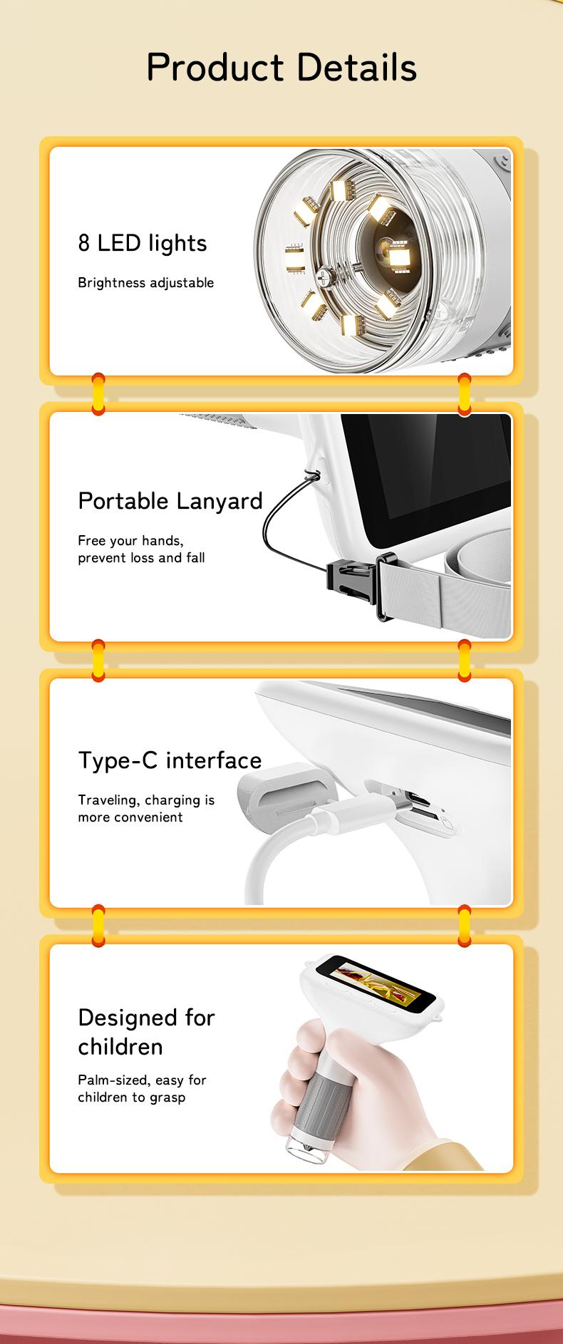 【Three-Level Adjustable Lighting】This digital microscope is equipped with eight adjustable LED lights. The brightness can be adjusted in three levels, ensuring clear visibility in low-light conditions, making it ideal for observing ladybugs, butterflies, and ants.