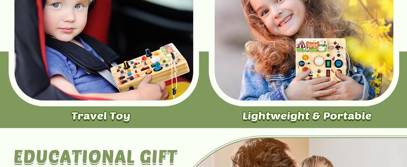 [High Quality Sensory Toys] Our toddler fidget toys is made of eco-wood, smooth product edges and all the various buttons, switches, and shifters are solidly installed. The busy board is high quality and very sturdy. You don't have to worry about your baby breaking it and it is very safe for your child. Soft light will not hurt the eyes of children.